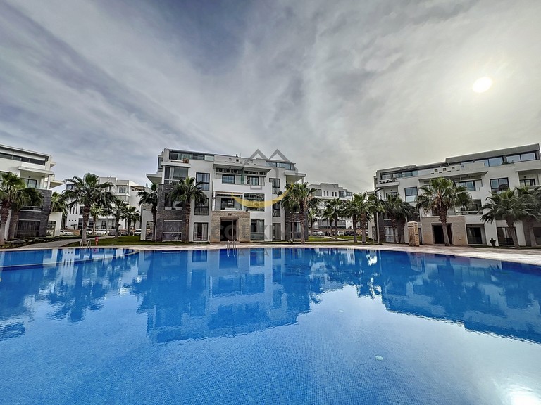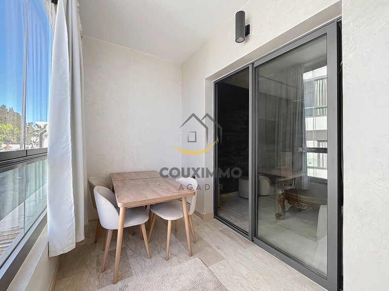 Agadir Founty: 79m² apartment comprising an entrance hall with an open-plan kitchen and living area, opening onto a first terrace. The apartment is pleasant, clean, and well-furnished/equipped for a short or medium-term stay.