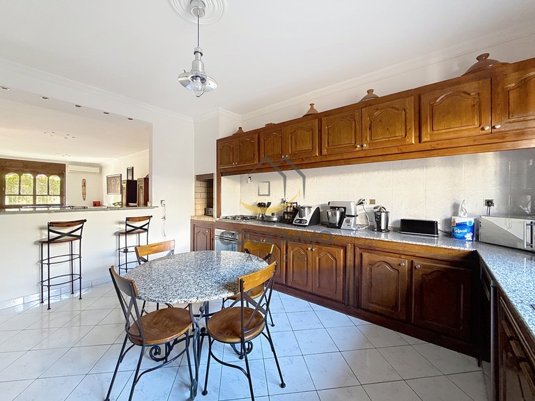 L’un des salons se prolonge harmonieusement vers une cuisine ouverte, conviviale et fonctionnelle, mêlant modernité et chaleur grâce à ses meubles en bois. L’ensemble crée un véritable lieu de vie, idéal pour recevoir comme pour le quotidien.