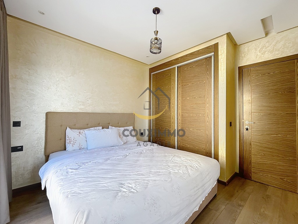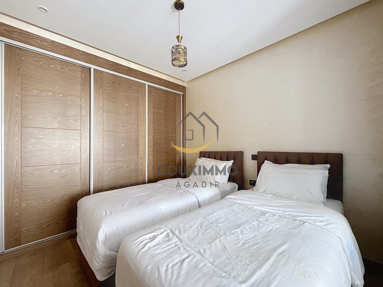 Agadir Founty: 79m² apartment comprising an entrance hall with an open-plan kitchen and living area, opening onto a first terrace. The apartment is pleasant, clean, and well-furnished/equipped for a short or medium-term stay.